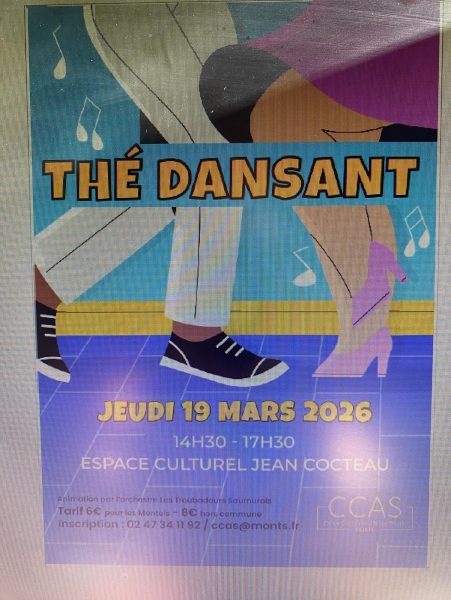 Date : Jeudi 19/03/2026 Horaires : 14h30 à 17h30 Tarifs : 6€ montois et 8€ hors Monts Organisateur : CCAS DE MONTS Adresse de l'événement : ESPACE JEAN COCTEAU 19 RUE DE LA VASSELIÈRE 37260 MONTS Informations complémentaires : Animation : Les Troubadours Saumurois. Danses musette, en ligne et tango. Goûter. Inscription préalable obligatoire. Danses pratiquées : Danses de salon, Danses en ligne (Line dance), Danses rétro, Tango Référence de l'annonce : 64535 call02 47 34 11 92call06 24 51 72 25