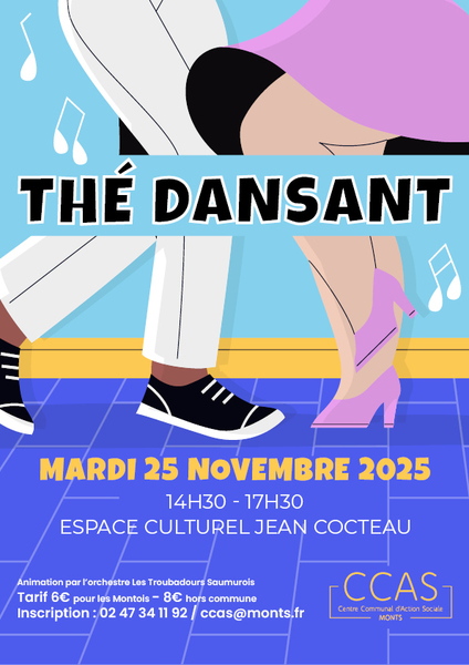Date : Mardi 25/11/2025 Horaires : 14h30-17h30 Tarifs : 6€ montois et 8€ hors commune Organisateur : CCAS DE MONTS Adresse de l'événement : 19 RUE DE LA VASSELIÈRE 37260 MONTS Informations complémentaires : Le CCAS de Monts organise un thé dansant animé par Les Troubadours Saumurois, le mardi 25 novembre de 14h30 à 17h30 à l'espace Cocteau à monts (37), inscription préalable au 0247341192 Danses pratiquées : Madison, Polka, Rock, Tango, Valse, Valse musette, Variété Référence de l'annonce : 53951 call02 47 34 11 92