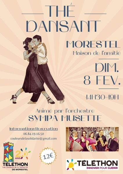 Date : 08/02/2026 (Événement passé) Horaires : de 14h30 à 19h Tarifs : 12€ Organisateur : COULEURS DE LA SOLIDARITÉ Adresse de l'événement : MAISON DE L'AMITIÉ 389 RUE FRANÇOIS PERRIN 38510 MORESTEL Informations complémentaires : Thé dansant au profit du Téléthon