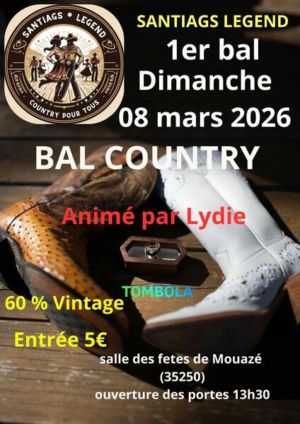Date : Dimanche 08/03/2026 Horaires : 13h30 Tarifs : Entrée 5€ Organisateur : SANTIAGS LEGEND Adresse de l'événement : SALLE DES FÊTES 35250 MOUAZE Informations complémentaires : Animation : Lydie. Ambiance 60 % vintage. Tombola sur place. Danses pratiquées : Country, Danses de salon, Danses en ligne (Line dance), Danses rétro Référence de l'annonce : 61758