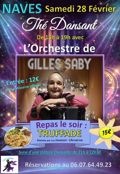 Date : Samedi 28/02/2026 Horaires : 15h à 19h Tarifs : 12€ pâtisserie offerte ; repas truffade 15€ Organisateur : ASS NAVE'Y DANSE Adresse de l'événement : SALLE POLYVALENTE DU PRÉ-BOURRU 19460 NAVES Informations complémentaires : Animation : Orchestre de Gilles Saby. Repas truffade réalisé par Luc Framont - L'Arverne. Clôture dansante de 21h à 22h30. Danses pratiquées : Danses de salon, Danses en ligne (Line dance), Danses rétro Référence de l'annonce : 64225 call06 07 64 49 23