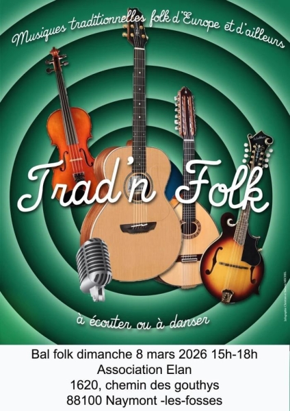 Date : Dimanche 08/03/2026 Horaires : 15h à 18h Organisateur : ASSOCIATION ÉLAN Adresse de l'événement : 1620 CHEMIN DES GOUTYS 88100 NAYEMONT LES FOSSES Informations complémentaires : Animation : Trad?n Folk. Musiques traditionnelles folk d?Europe et d?ailleurs. À écouter ou à danser. Danses pratiquées : Danse folklorique Référence de l'annonce : 63900