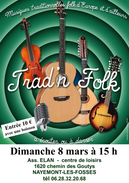 Date : Dimanche 08/03/2026 Horaires : 15h Tarifs : 10€ Organisateur : ASSOCIATION D'ÉDUCATION DE LOISIRS ET D'ACTIVITÉS Adresse de l'événement : 1620 CHEMIN DES GOUTYS 88100 NAYEMONT LES FOSSES Informations complémentaires : Entrée avec une boisson. Musiques traditionnelles folk d'Europe et d'ailleurs, à écouter ou à danser. Buvette. Danses pratiquées : Danse folklorique Référence de l'annonce : 64457 call03 29 50 60 95call06 28 32 20 68