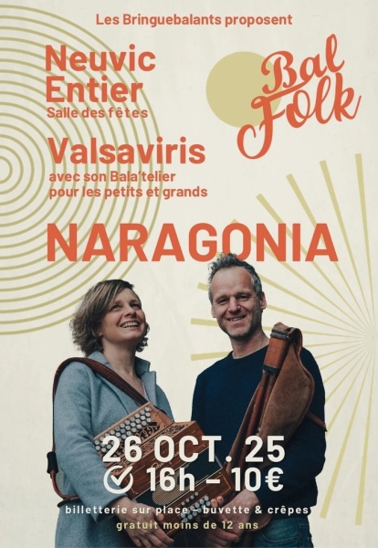 Date : Dimanche 26/10/2025 Horaires : 16h à 20h Tarifs : 10€ (gratuit pour les moins de 12 ans) Organisateur : LES BRINGUEBALANTS Adresse de l'événement : SALLE DES FÊTES RUE DE LA RÉPUBLIQUE 87130 NEUVIC ENTIER Informations complémentaires : Animation : Naragonia et Valsaviris & Anne Barteau. Bala'telier à 16h suivi du bal à 17h. Ouverture des portes à 15h30. Buvette et crêpes proposées pour le goûter. Rencontre intergénérationnelle et ambiance conviviale. Danses pratiquées : Danse folklorique Référence de l'annonce : 52315
