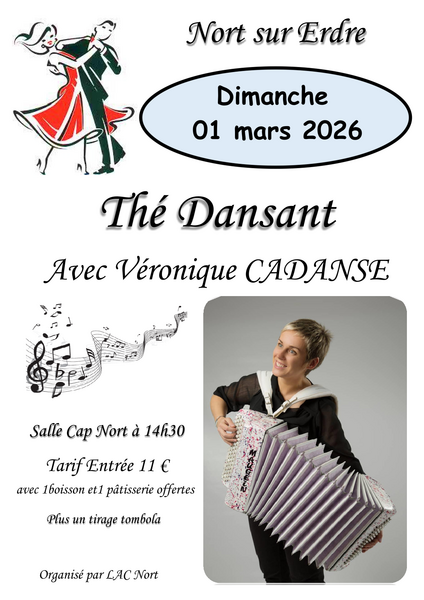 Date : Dimanche 01/03/2026 Horaires : 14H30 à 19h30 Tarifs : 11€ avec 1 boisson et 1 pâtisserie offertes et tirage tombola Organisateur : LAC NORT Adresse de l'événement : SALLE CAP NORT ROUTE DE HÉRIC 44390 NORT SUR ERDRE Danses pratiquées : Danses de salon, Danses en ligne (Line dance), Disco, Madison, Paso-doble Référence de l'annonce : 61883 call06 33 14 22 61