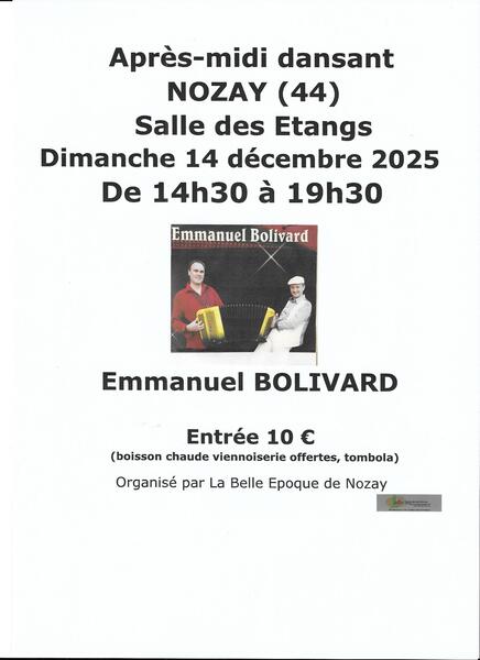 Date : Dimanche 14/12/2025 Horaires : 14h30-19h30 Tarifs : 10€ Organisateur : LA BELLE EPOQUE DE NOZAY 44 Adresse de l'événement : 3 RUE DE LA BASE DES LOISIRS 44170 NOZAY Informations complémentaires : Après-midi dansant le 14 décembre 2025 à Nozay, salle des Etangs, avec l'orchestre d'Emmanuel BOLIVARD-Cascade de 14h30 à 19h30. Ouverture des portes à 13h45. Tarifs : 10€ (entrée, une boisson chaude, madeleines, tombola). Tous types de danse : de salon et en ligne. Organisé par La Belle Epoque de Nozay. Renseignements au 0680914000 ou 0606442229 Danses pratiquées : Danses de salon, Danses en ligne Référence de l'annonce : 53957 call06 80 91 40 00