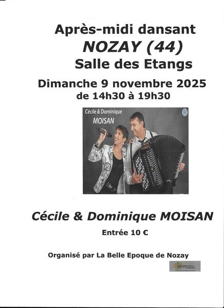 Date : Dimanche 09/11/2025 Horaires : 14h30-19h30 Tarifs : 10€ Organisateur : LA BELLE EPOQUE DE NOZAY 44 Adresse de l'événement : 3 RUE DE LA BASE DES LOISIRS 44170 NOZAY Informations complémentaires : Après-midi dansant le 9 novembre 2025 à Nozay, salle des Etangs, avec l'orchestre de Cécile&Dominique MOISAN de 14h30 à 19h30. Ouverture des portes à 13h45. Tarifs : 10€ (entrée, une boisson chaude, madeleines, tombola). Tous types de danse : de salon et en ligne. Organisé par La Belle Epoque de Nozay. Renseignements au 0680914000 ou 0606442229 Danses pratiquées : Danses de salon, Danses en ligne Référence de l'annonce : 50558 call06 80 91 40 00call06 06 44 22 29