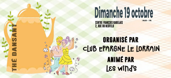 Date : Dimanche 19/10/2025 Horaires : 14h30-19h Organisateur : CLUB ÉPARGNE LE LORRAIN Adresse de l'événement : CENTRE FRANÇOIS RABELAIS 2 RUE DU NEUFELD 67210 OBERNAI Informations complémentaires : Animation : Orchestre Les Wind's. Danses pratiquées : Danses de salon, Danses en ligne, Danses rétro Référence de l'annonce : 52041