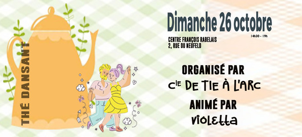 Date : Dimanche 26/10/2025 Horaires : 14h30-19h Organisateur : COMPAGNIE DE TIR À L'ARC Adresse de l'événement : CENTRE FRANÇOIS RABELAIS 2 RUE DU NEUFELD 67210 OBERNAI Informations complémentaires : Animation : Orchestre Violetta. Danses pratiquées : Danses de salon, Danses en ligne, Danses rétro Référence de l'annonce : 52042