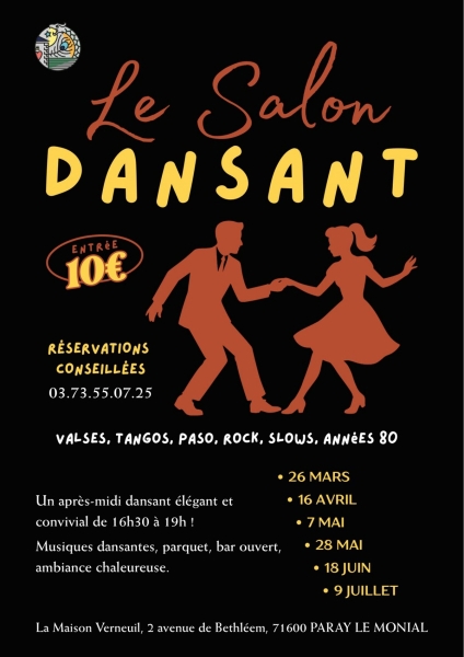 Dates : Jeudi 26/03/2026, Jeudi 16/04/2026, Jeudi 07/05/2026, Jeudi 28/05/2026, Jeudi 18/06/2026 (1 autre date), Jeudi 09/07/2026 Horaires : 16h30 à 19h Tarifs : 10€ Organisateur : LA MAISON VERNEUIL Adresse de l'événement : LA MAISON VERNEUIL 2 AVENUE DE BÉTHLÉEM 71600 PARAY LE MONIAL Informations complémentaires : Valses, tangos, paso, rock, slows, années 80. Salle en parquet. Bar ouvert. Ambiance chaleureuse. Accès adapté aux personnes à mobilité réduite. Réservations conseillées. Non conseillé aux enfants. Danses pratiquées : Danses de salon, Danses en ligne (Line dance), Danses rétro, Disco, Rock, Tango, Valse Référence de l'annonce : 64098 call03 73 55 07 25