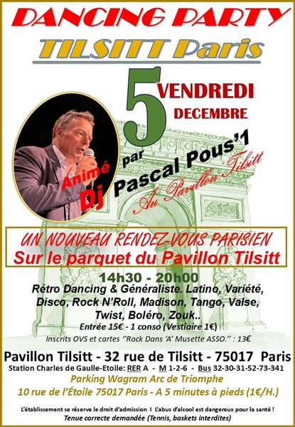 Date : Vendredi 05/12/2025 Horaires : 14h30 à 20h Tarifs : 15€ (1 consommation incluse, vestiaire 1€). Tarif OVS et cartes Rock Dans l'A Musette ASSO Organisateur : ROCK DANS L'A MUSETTE ASSO. Adresse de l'événement : PAVILLON TILSITT 32 RUE DE TILSITT 75017 PARIS 17 Informations complémentaires : Animation : DJ Pascal Pous'1. Programme : danses rétro et généralistes (latino, variété, disco, rock'n'roll, madison, tango, valse, twist, boléro, zouk). Parking Wagram Arc de Triomphe à 5 minutes à pied (1€/h). Tenue correcte exigée, tennis et baskets interdits. L'établissement se réserve le droit d'admission. Danses pratiquées : Boléro, Danses de salon, Danses en ligne, Danses latino, Danses rétro, Disco en ligne, Madison, Rock, Tango, Twist, Valse, Variété, Zouk Référence de l'annonce : 56918