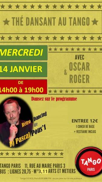 Date : Mercredi 14/01/2026 Horaires : 14h à 19h Tarifs : Entrée 12€ Organisateur : TANGO PARIS Adresse de l'événement : TANGO PARIS 11 RUE AU MAIRE 75003 PARIS 03 Informations complémentaires : Animation : DJ Pascal Pous'1 et Oscar Roger. Programme Rétro Dancing. 1 consommation de base et vestiaire inclus. Bus lignes 20 et 75. Métro lignes 3 et 11 Arts et Métiers. Danses pratiquées : Danses de salon, Danses en ligne (Line dance), Danses rétro, Tango Référence de l'annonce : 61710