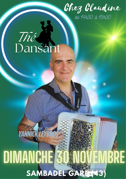 Date : Dimanche 30/11/2025 Horaires : 14h30 à 19h30 Organisateur : CHEZ CLAUDINE Adresse de l'événement : CHEZ CLAUDINE SAMBADEL GARE 43230 PAULHAGUET Informations complémentaires : Animation : Orchestre Yannick Leybros. Danses pratiquées : Danses de salon, Danses en ligne, Danses rétro, Samba Référence de l'annonce : 53240