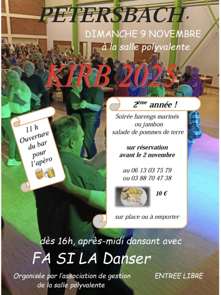 Date : 09/11/2025 (Événement passé) Horaires : 16h Tarifs : Gratuit Organisateur : ASSOCIATION DE GESTION DE LA SALLE POLYVALENTE DE Adresse de l'événement : SALLE POLYVALENTE RUE PRINCIPALE 67290 PETERSBACH Informations complémentaires : Animation : Orchestre FA SI LA DANSER. Ouverture du bar à 11h pour l'apéritif. Repas harengs marinés ou jambon salade de pommes de terre dès 18h, sur réservation avant le 2 novembre. Tarif repas 10€ sur place ou à emporter. Entrée libre. Danses pratiquées : Danses de salon, Danses en ligne, Danses rétro Référence de l'annonce : 53861 call07 79 99 93 46call06 13 03 75 79