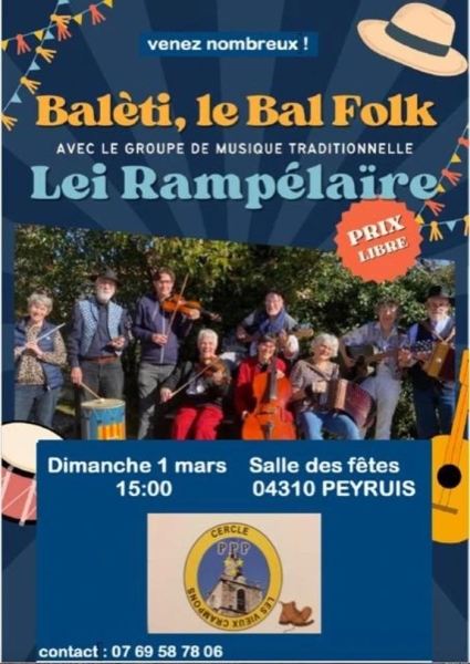 Date : Dimanche 01/03/2026 Horaires : 15h à 18h Tarifs : Entrée au chapeau. Prix libre. Adresse de l'événement : SALLE DES FÊTES 04310 PEYRUIS Informations complémentaires : Animation : Lei Rampélaire. Bal folk. Venez nombreux. Danses pratiquées : Danse folklorique Référence de l'annonce : 63797 call07 69 58 78 06
