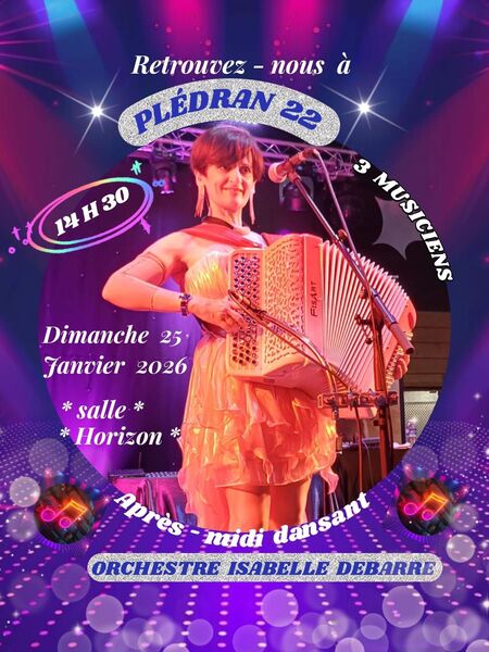 Date : Dimanche 25/01/2026 Horaires : 14h30 Adresse de l'événement : SALLE HORIZON 22960 PLEDRAN Informations complémentaires : Animation : Orchestre Isabelle Debarre (3 musiciens). Danses pratiquées : Danses de salon, Danses en ligne (Line dance), Danses rétro Référence de l'annonce : 62104