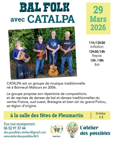Date : Dimanche 29/03/2026 Horaires : 15h à 18h Tarifs : Entrée 6€ Organisateur : L'ATELIER DES POSSIBLES Adresse de l'événement : SALLE DES FÊTES 86450 PLEUMARTIN Danses pratiquées : Danse folklorique Référence de l'annonce : 64985 call06 52 91 57 44