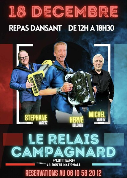Date : Jeudi 18/12/2025 Horaires : 12h à 18h30 Adresse de l'événement : LE RELAIS CAMPAGNARD 23 ROUTE NATIONALE 62760 POMMERA Informations complémentaires : Animation : Stéphane Varetz, Hervé Delohen, Michel Varetz. Danses pratiquées : Danses de salon, Danses en ligne, Danses rétro Référence de l'annonce : 56418 call06 10 58 20 12