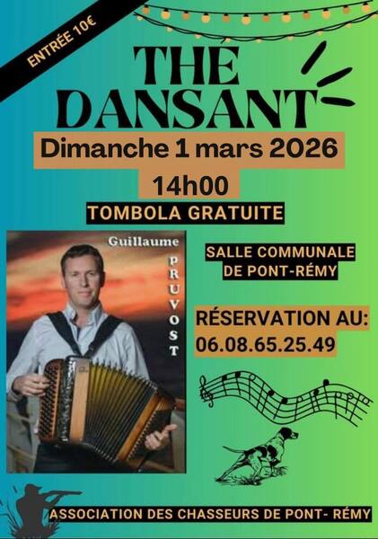 Date : Dimanche 01/03/2026 Horaires : 14h Tarifs : Entrée 10€ Organisateur : ASSOCIATION DES CHASSEURS DE PONT-RÉMY Adresse de l'événement : SALLE COMMUNALE 80580 PONT REMY Informations complémentaires : Animation : Orchestre Guillaume Pruvost. Tombola gratuite. Danses pratiquées : Danses de salon, Danses en ligne (Line dance), Danses rétro Référence de l'annonce : 63082 call06 08 65 25 49