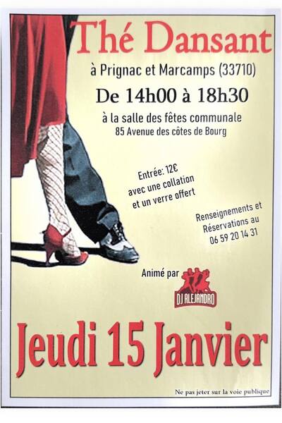Date : Jeudi 15/01/2026 Horaires : De 14h à 18h30 Tarifs : Entrée : 12€ Adresse de l'événement : SALLE DES FÊTES COMMUNALE 85 AVENUE DES CÔTES DE BOURG 33710 PRIGNAC ET MARCAMPS Informations complémentaires : Animation : DJ Alejandro. Collation et un verre offerts. Danses pratiquées : Danses de salon, Danses en ligne (Line dance), Danses rétro Référence de l'annonce : 61697 call06 59 20 14 31