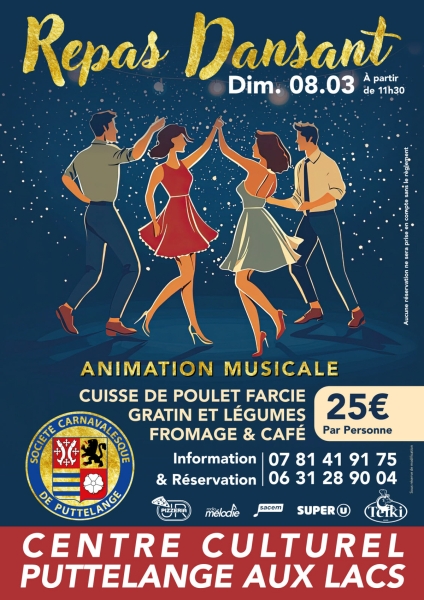 Date : Dimanche 08/03/2026 Horaires : 11h30 Tarifs : 25€ Organisateur : SOCIÉTÉ CARNAVALESQUE DE PUTTELANGE Adresse de l'événement : ESPACE CULTUREL 1 RUE JEAN-MOULIN 57510 PUTTELANGE AUX LACS Informations complémentaires : Animation : Fabien Martin. Menu : cuisse de poulet farcie, gratin dauphinois, légumes, fromage, café. Accès adapté aux personnes à mobilité réduite. Danses pratiquées : Danses de salon, Danses en ligne (Line dance), Danses rétro Référence de l'annonce : 65082 call06 82 16 53 47call07 81 41 91 75