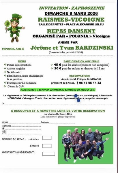 Date : Dimanche 08/03/2026 Horaires : 12h30 à 18h Tarifs : 45€ adultes, 30€ enfants de moins de 12 ans (boissons non comprises) Organisateur : POLONIA VICOIGNE Adresse de l'événement : SALLE DES FÊTES PLACE ALEXANDRE LELEU 59590 RAISMES Informations complémentaires : Animation : Jérôme et Yvan Bardzinski. Thème : Saint-Patrick, Acte II. Ouverture des portes à 12h30. Menu : potage aux cornichons, assiette anglaise, filet mignon sauce champignons avec garniture, fromages sur lit de salade, gâteau et café. Réservation obligatoire avant le 2 mars 2026. Dress code : vêtement ou accessoire de couleur verte. Danses pratiquées : Danses de salon, Danses en ligne (Line dance), Danses rétro Référence de l'annonce : 63906 call06 13 95 14 32