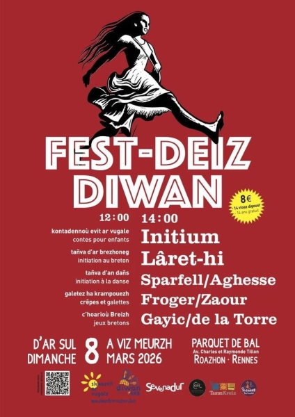 Date : Dimanche 08/03/2026 Horaires : 12h à 16h Tarifs : 8€ Organisateur : DIWAN Adresse de l'événement : 26 AVENUE CHARLES ET RAYMONDE TILLON 35000 RENNES Informations complémentaires : Animation : Initium, Lâret-hi, Sparfell/Aghesse, Froger/Zaour, Gayic/de la Torre. Parquet de bal. Contes pour enfants. Initiation au breton. Initiation à la danse. Crêpes et galettes. Jeux bretons. Danses pratiquées : Danse bretonne Référence de l'annonce : 63907