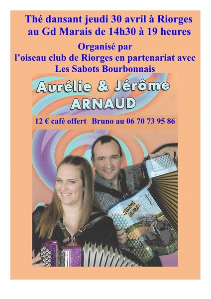 Date : Jeudi 30/04/2026 Horaires : 14h30 à 19h Tarifs : 12€ par personne (café offert) Organisateur : OISEAU CLUB DE RIORGES EN PARTENARIAT AVEC LES SAB Adresse de l'événement : GRAND MARAIS 42153 RIORGES Informations complémentaires : Animation : Aurélie & Jérôme Arnaud (Maugein). Ambiance musette et variétés. Collation café offerte. Moment convivial pour tous les danseurs. Danses pratiquées : Danses de salon, Danses en ligne (Line dance), Danses rétro, Variété Référence de l'annonce : 63351 call06 70 73 95 86