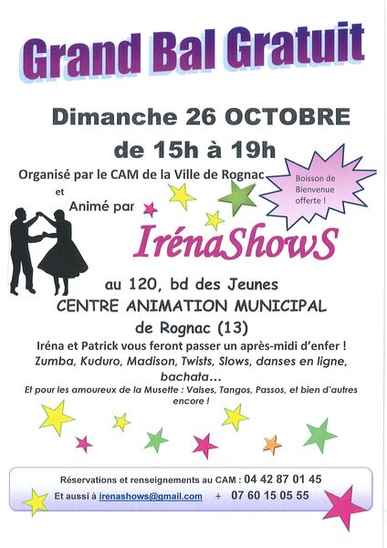 Date : Dimanche 26/10/2025 Horaires : 15H à 19h Tarifs : gratuit Organisateur : IRENASHOWS Adresse de l'événement : 120 BD DES JEUNES CENTRE ANIMATION SALLE DES FETES 13340 ROGNAC Informations complémentaires : GRAND BAL GRATUIT avec IRENASHOWS120 Danses pratiquées : Danses en ligne, Danses latino, Danses rétro, Variété Référence de l'annonce : 53286 call07 60 15 05 55