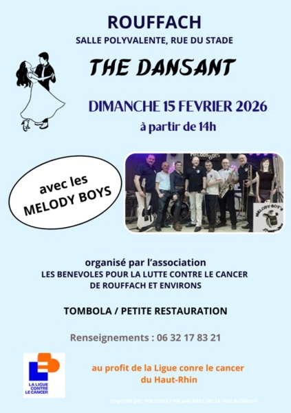 Date : Dimanche 15/02/2026 Horaires : 14h à 21h Tarifs : 10€ Organisateur : BÉNÉVOLES POUR LA LUTTE CONTRE LE CANCER DE ROUFFA Adresse de l'événement : SALLE POLYVALENTE RUE DU STADE 68250 ROUFFACH Informations complémentaires : Animation : Orchestre Mélody Boys. Tombola. Petite restauration. Au profit de la Ligue contre le cancer du Haut-Rhin. Danses pratiquées : Danses de salon, Danses en ligne, Danses rétro, Rock, Swing, Valse Référence de l'annonce : 61474 call06 32 17 83 21