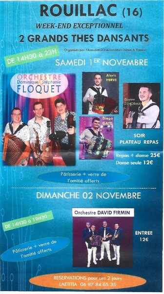 Dates : Samedi 01/11/2025, Dimanche 02/11/2025 Horaires : À partir de 14h30 Tarifs : Repas + danse 25€ Danse seule 12€ Entrée 12€ Organisateur : ASSOCIATION ACCORDÉON DANSES ET PASSIONS Adresse de l'événement : 16170 ROUILLAC Informations complémentaires : Animation : Orchestre Dominique & Stéphanie FLOQUET, Alexis HERVE, Clément BRUNEAU, Diego GATE. Animation : Orchestre DAVID FIRMIN. Pâtisserie + verre de l'amitié offerts. Soir plateau repas. Réservations pour ces 2 jours : Laetitia 0687846535. Danses pratiquées : Danses de salon, Danses en ligne, Danses rétro Référence de l'annonce : 48733 call06 87 84 65 35