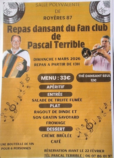 Date : Dimanche 01/03/2026 Horaires : 12h Tarifs : Repas + bal 33€ ; bal seul 12€ Organisateur : FAN CLUB DE PASCAL TERRIBLE Adresse de l'événement : SALLE DES FÊTES LE BOURG 87400 ROYERES Informations complémentaires : Repas à partir de 13h. Menu : apéritif, salade de truite fumée, ragoût de dinde et gratin savoyard, fromage, crème brûlée, café. Une bouteille de vin pour 6 personnes. Réservation avant le 22 février. Danses pratiquées : Danses de salon, Danses en ligne (Line dance), Danses rétro Référence de l'annonce : 64226 call06 07 86 01 97