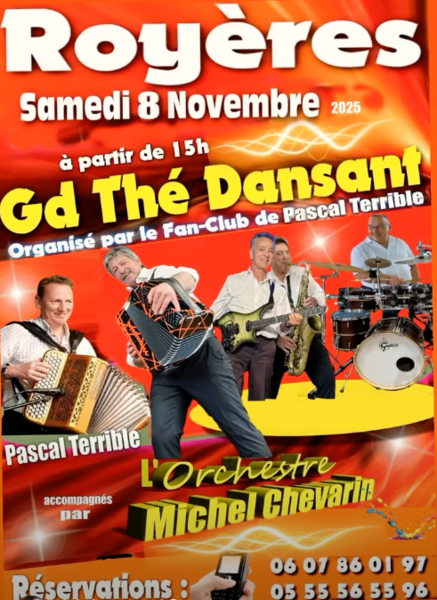 Date : Samedi 08/11/2025 Horaires : 15h Organisateur : FAN-CLUB DE PASCAL TERRIBLE Adresse de l'événement : SALLE DES FÊTES 87400 ROYERES Informations complémentaires : Animation : Pascal Terrible et l'Orchestre Michel Chevarin. Danses pratiquées : Danses de salon, Danses en ligne, Danses rétro Référence de l'annonce : 55109 call06 07 86 01 97call05 55 56 55 96
