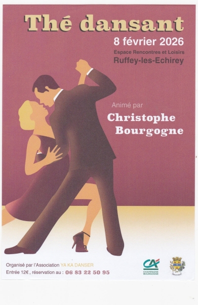 Date : Dimanche 08/02/2026 Horaires : 14h30 Tarifs : 12€ Organisateur : ASSOCIATION YA KA DANSER Adresse de l'événement : ESPACE RENCONTRES ET LOISIRS RUE DU BAMONT 21490 RUFFEY LES ECHIREY Informations complémentaires : Animation : Christophe Bourgogne. Réservation possible. Buvette et brioches. Danses pratiquées : Danses de salon, Danses en ligne, Danses rétro Référence de l'annonce : 61376 call06 83 22 50 95