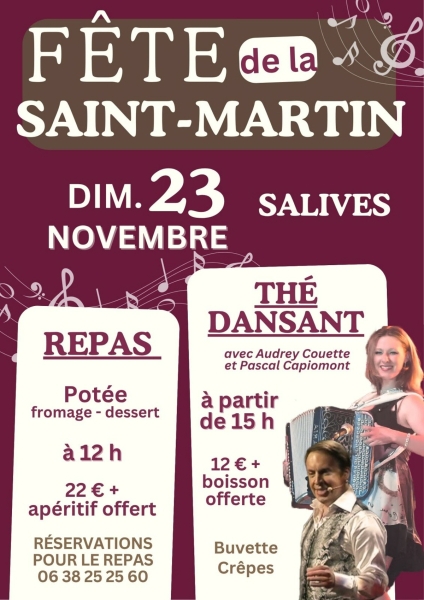 Date : Dimanche 23/11/2025 Horaires : 15h Tarifs : 12€ avec 1 boisson offerte Organisateur : ASSOCIATION SPORTS ET LOISIRS DE SALIVES Adresse de l'événement : SALLE DES FÊTES 21580 SALIVES Informations complémentaires : Animation : Audrey Couette accordéoniste et Pascal Capiomont chanteur. Musette, rock, danses en ligne. Buvette et crêpes. Repas à 12h, potée, fromage, dessert et apéritif offert, 22€ sur réservation auprès du restaurant Le Pré Saint-Georges. Danses pratiquées : Danses de salon, Danses en ligne, Danses rétro, Rock Référence de l'annonce : 53900 call06 38 25 25 60