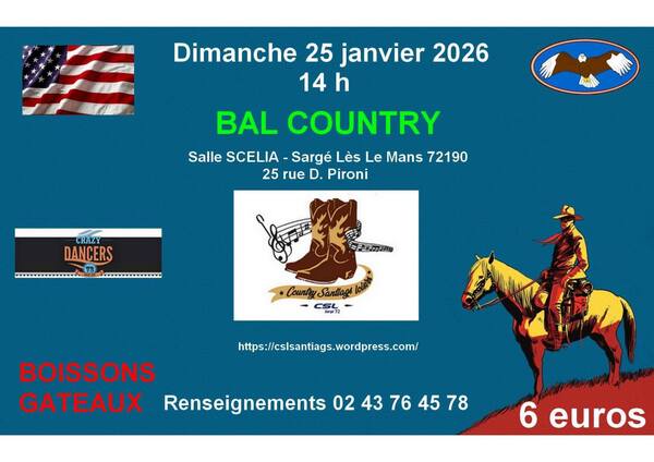 Date : Dimanche 25/01/2026 Horaires : 14h Tarifs : 6€ Adresse de l'événement : SALLE SCEALIA 25 RUE DENIS PIRONI 72190 SARGE LES LE MANS Informations complémentaires : Boissons. Gâteaux. Danses pratiquées : Country Référence de l'annonce : 57002 call02 43 76 45 78