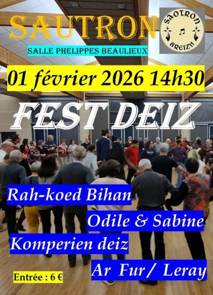 Date : Dimanche 01/02/2026 Horaires : 14h30 à 18h30 Tarifs : Entrée 6€ Organisateur : ASSOCIATION SAOTRON BREIZH Adresse de l'événement : ESPACE PHELIPPES BEAULIEUX 21 RUE DE LA FORÊT 44880 SAUTRON Informations complémentaires : Animation : Rah-koed Bihan, Odile & Sabine, Komperien deiz, Ar Fur / Leray. Danses pratiquées : Danse bretonne Référence de l'annonce : 61269