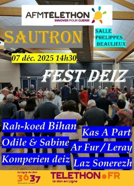 Date : 07/12/2025 (Événement passé) Horaires : 14h30 à 18h30 Organisateur : AFM TÉLÉTHON Adresse de l'événement : ESPACE PHELIPPES BEAULIEUX 21 RUE DE LA FORÊT 44880 SAUTRON Informations complémentaires : Animation : Rah-koed Bihan, Odile & Sabine, Komperien Deiz, Kas A Part, Ar Fur / Leray, Laz Sonerezh. Danses de Basse et Haute Bretagne et des pays celtes. Environ cinquante danses pratiquées dans l'après-midi. Événement caritatif Téléthon. Salle Phelippes Beaulieux. Danses pratiquées : Danse bretonne Référence de l'annonce : 56028