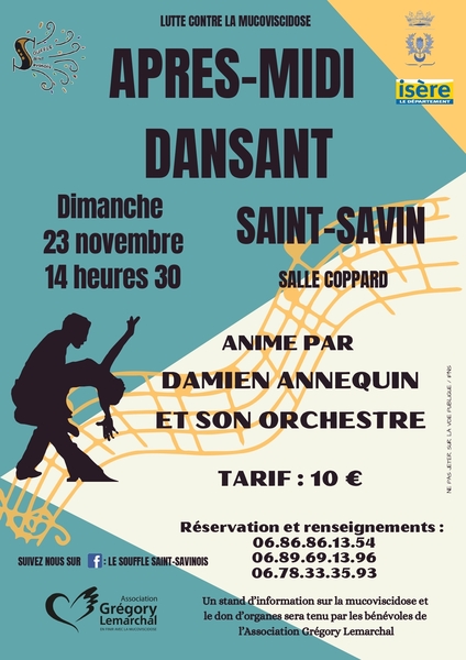 Date : Dimanche 23/11/2025 Horaires : 14H30 A 18H30 Tarifs : 10 Organisateur : LE SOUFFLE SAINT SAVINOIS Adresse de l'événement : RUE DE LA MAIRIE SALLE COPPARD 38300 ST SAVIN Informations complémentaires : Orchestre Damien Annequin Danses pratiquées : Danses de salon Référence de l'annonce : 52505 call06 86 86 13 54