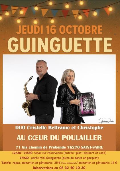 Date : Jeudi 16/10/2025 Horaires : 14h30 Tarifs : Repas, animation et pâtisserie 35€ (boissons incluses) / animation et pâtisserie 12€ Organisateur : RESTAURANT AU COEUR DU POULAILLER Adresse de l'événement : RESTAURANT AU C?UR DU POULAILLER 71 BIS CHEMIN DE PRÉBENDE 76270 ST SAIRE Informations complémentaires : Animation : Duo Cristelle Beltrame et Christophe. Repas sur réservation (entrée, plat, dessert et café). Piste de danse en parquet. Danses pratiquées : Danses de salon, Danses en ligne, Danses rétro Référence de l'annonce : 53158 call06 32 40 10 20
