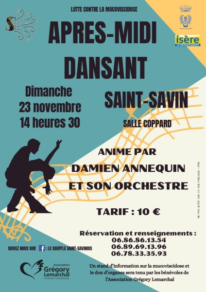 Date : Dimanche 23/11/2025 Horaires : 14h30 à 19h Tarifs : 10€ Organisateur : LE SOUFFLE SAINT SAVINOIS Adresse de l'événement : SALLE COPPARD 33920 ST SAVIN Informations complémentaires : Animation : Damien Annequin et son orchestre. Lutte contre la mucoviscidose. Stand d'information sur la mucoviscidose et le don d'organes tenu par les bénévoles de l'Association Grégory Lemarchal. Danses pratiquées : Danses de salon, Danses en ligne, Danses rétro Référence de l'annonce : 53894 call06 86 86 13 54call06 78 33 35 93