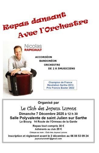 Date : Dimanche 07/12/2025 Horaires : 12h30 à 18h Tarifs : Repas tout compris 30€; adhérents au club 20€ Organisateur : CLUB DES JOYEUX LURONS Adresse de l'événement : SALLE POLYVALENTE 14 ROUTE DE L'ORMEAU-DE-LA-GARDE 61170 ST JULIEN SUR SARTHE Informations complémentaires : Animation : Orchestre Nicolas Rapicault. Accordéon, bandonéon. Orchestre de 2 à 5 musiciens. Champion de France, Révélation Sarthe 2013, Prix Francis Baxter 2022. Inscription et règlement avant le 1er décembre. Danses pratiquées : Danses de salon, Danses en ligne, Danses rétro Référence de l'annonce : 56693 call06 08 53 09 24
