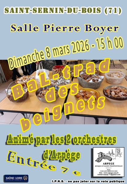 Date : Dimanche 08/03/2026 Horaires : 15h Tarifs : 7€ Organisateur : ARPÈGE Adresse de l'événement : SALLE PIERRE BOYER 1920 ROUTE DE SAINT-SERNIN 71200 ST SERNIN DU BOIS Informations complémentaires : Animation : Orchestres d'Arpège. Danses : polkas, mazurkas, valses, scottishs, bourrées et danses régionales variées. Danses pratiquées : Danse folklorique Référence de l'annonce : 64456 call03 85 57 32 06
