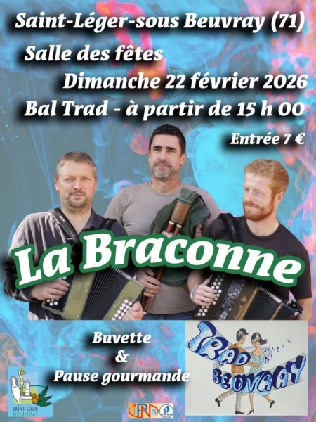 Date : Dimanche 22/02/2026 Horaires : 15h à 19h Tarifs : Entrée 7€ Adresse de l'événement : SALLE DES FÊTES LE BOURG 71990 ST LEGER SOUS BEUVRAY Informations complémentaires : Animation : La Braconne. Accordéons diatoniques : Maurice Van Tiel et Adrien Cougny. Cornemuse et violon : Julien Fauchier. Pause gourmande proposée pendant le bal. Buvette. Danses pratiquées : Danse folklorique Référence de l'annonce : 62688