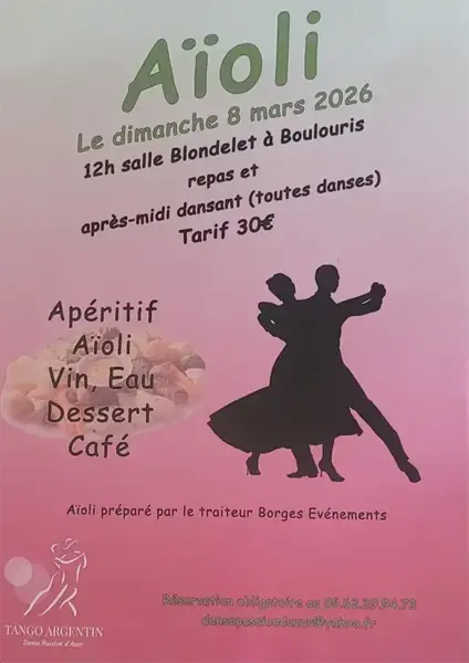 Date : Dimanche 08/03/2026 Horaires : 12h à 19h Tarifs : 30€ (repas + dansant) Organisateur : ASSOCIATION DANSE PASSION D'AZUR Adresse de l'événement : SALLE BLONDELET BOULOURIS 83530 ST RAPHAEL Danses pratiquées : Danses de salon, Danses en ligne (Line dance), Danses latino, Danses rétro, Rock, Tango Référence de l'annonce : 64306 call06 62 39 94 73call06 12 39 94 72