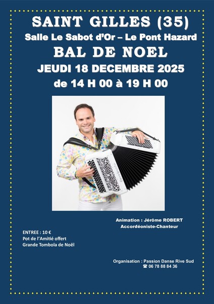 Date : Jeudi 18/12/2025 Horaires : 14h00 à 19h00 Tarifs : 10€ Organisateur : PASSION DANSE RIVE SUD Adresse de l'événement : SALLE LE SABOT D'OR LE PONT HAZARD 35590 ST GILLES Informations complémentaires : Animation assurée par l'excellent accordéoniste, Jérôme Robert, accompagné de Jean-François Martinez à la voix d'or, dans la très belle salle du Sabot d'Or qui dispose d'un très bon parquet apprécié des danseurs.