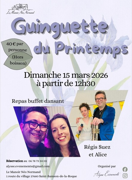 Date : Dimanche 15/03/2026 Horaires : 12H30-18H00 Tarifs : 40€ / PERSONNE hors Boisson Organisateur : SAS ALYSSE EVENEMENTS Adresse de l'événement : LE MANOIR NEO NORMAND 1, ROUTE DU VILLAGE SAINT SAMSON DE LA ROQUE 27680 ST SAMSON DE LA ROQUE Danses pratiquées : Danses de salon, Danses en ligne (Line dance), Danses rétro, Disco, Madison, Paso-doble, Rock, Valse musette, Variété Référence de l'annonce : 64283 call06 78 73 34 03
