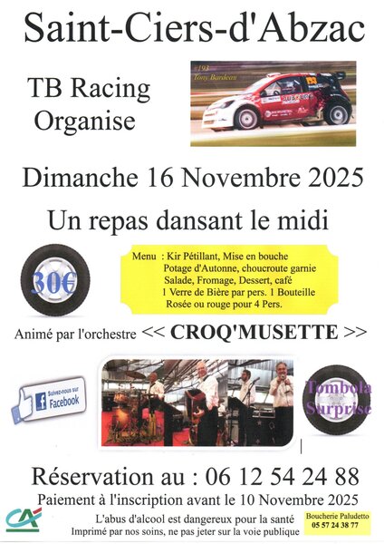 Date : Dimanche 16/11/2025 Horaires : 12 heure Tarifs : 30€ Organisateur : COMITÉ DES FÊTES DE SAINT DENIS DE PILE Adresse de l'événement : 31 RUE MAX LINDER 33910 ST CIERS D ABZAC Informations complémentaires : TB Racing organise le 16 novembre 2025 un repas dansant le midi animé par CROQ'MUSETTE pour remercier ses partenaires et amis lors des compétitions de cette année Danses pratiquées : Danses de salon, Danses en ligne, Madison, Rumba, Tango, Valse musette Référence de l'annonce : 51404 call06 12 54 24 88