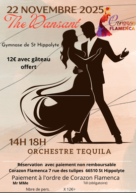 Date : Samedi 22/11/2025 Horaires : 14h-18h Tarifs : 12€ Organisateur : ASSOCIATION CORAZON FLAMENCA Adresse de l'événement : RUE MERMOZ LE GYMNASE SE SITUE À CÔTÉ DE LA MAIRIE 66510 ST HIPPOLYTE Informations complémentaires : L'association corazon flamenca organise un thé dansant le samedi 22 novembre 2025 de 14h-18h en collaboration avec l'orchestre tequila au gymnase de Saint-Hippolyte.