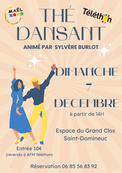 Date : Dimanche 07/12/2025 Horaires : 14h à 19h Tarifs : 10€ Organisateur : ASSOCIATION MAËL Adresse de l'événement : ESPACE DU GRAND-CLOS 35190 ST DOMINEUC Informations complémentaires : Animation : Sylvère Burlot. Événement au profit du Téléthon. Réservation conseillée avant le 7 décembre. Danses pratiquées : Danses de salon, Danses en ligne, Danses rétro Référence de l'annonce : 56697 call06 85 56 83 92